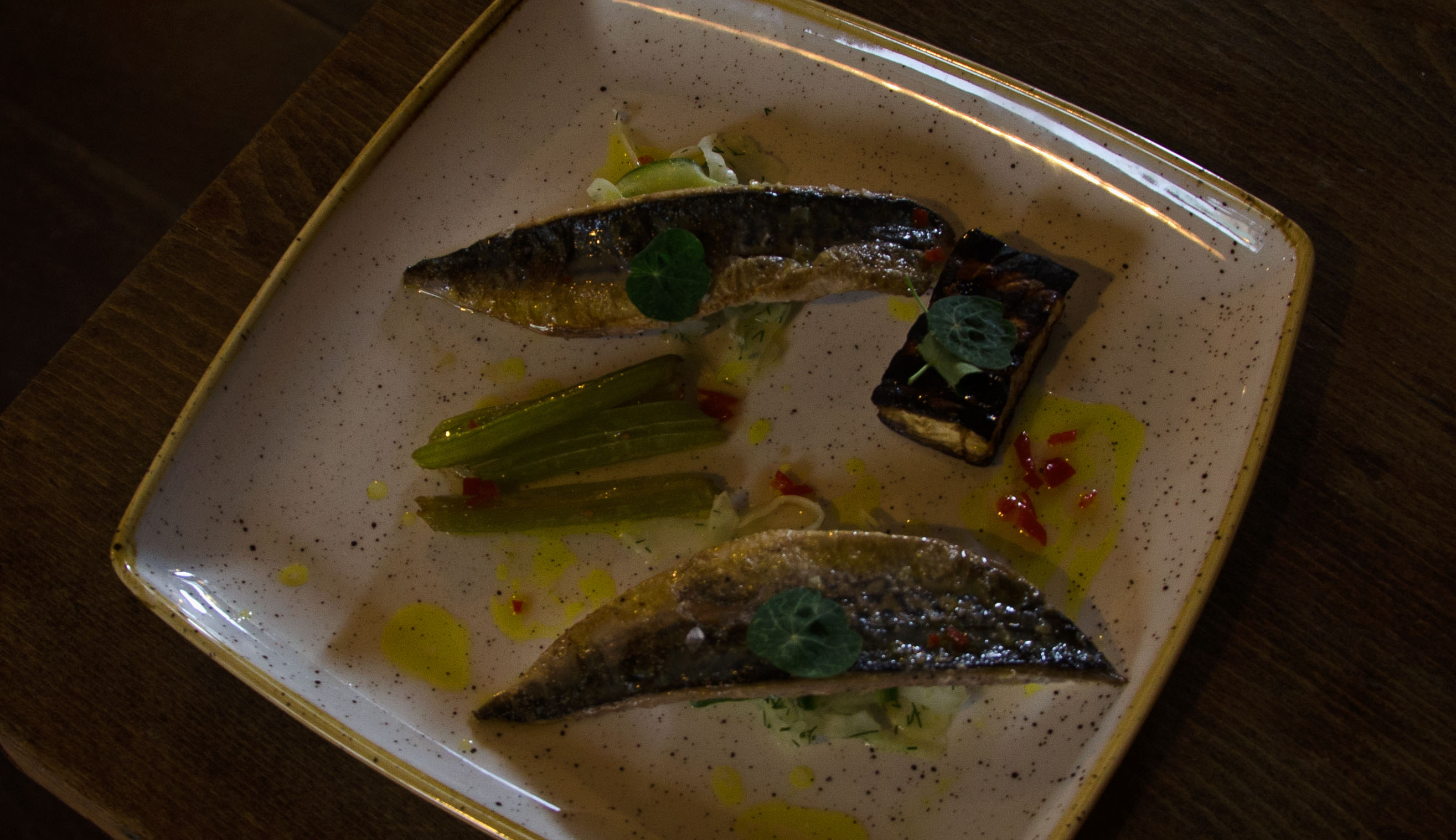 I chose the pan-fried mackerel and barbecued celeriac with lime and chilli dressing for my main course which was on the set menu. Two sizeable mackerel fillets were presented, each atop a small pile of shaved fennel dressed in dill. The fish was perfectly cooked and worked so well with the subtle aniseed flavours beneath. I also adored the flavour of the oblong-shaped barbecued celeriac – the slightly charred and smoky taste worked well with softness of the rest of the dish.